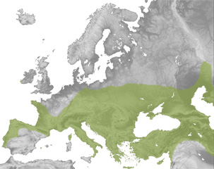 Eskualde paleartikora mugaturiko banaketa zabala du, Ozeano Atlantikotik Ozeano Pazifikoraino hedatzen dena 23º eta 56º latitudeen tartean. Europan iparraldeko muga Frantzia eta Alemania iparraldean du, eta hegoaldekoa Iberiar Penintsulan. Izan ere, Penintsulako etenik gabeko banaketa ipar eta ipar-mendebaldera mugaturik dago, eta gainerako eremu mediterraneoan populazio isolatuak ezagutzen dira, Sistema Zentralean eta Huelvan, esaterako (Palomo et al. 2007).