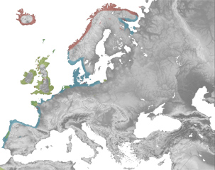 Ipar Amerika, Europa eta Asia iparraldeko kostaldeetan bizi da. Kolonia nagusiak leku jakin batzuetan pilatzen dira udaberrian, baina neguan kostalde guztira zabaltzen dira hegaztiak. Atlantiko ekialdeko gazteek dispertsio-hegaldi luzeak egiten dituzte, zenbaitetan kontinentea zeharkatu eta Mediterraneoraino iritsiz. Ondorioz, espeziearen banaketa geografikoa oso zabala da.