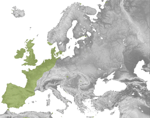 Europako hego-mendebaldean zehar banaturik dago. Bere iparraldeko muga Erresuma Batuan eta Norbegian du, ekialdekoa Grezia eta Txipren eta Hegoaldekoa Afrikako iparraldean (Maroko eta Tunezen). Euskal Herrian ez da oso landare arrunta baina Nafarroako zenbait antziretan aurki daiteke, esaterako Belaten, Bardeetan, Pulgerreko urmaelean eta Ultzamako hariztietan.