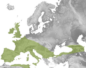 Europa mendebaldean eta hegoaldean oso hedatuta dago, eta, Asia erdialdera eta Afrika iparraldera iristen da. Euskal Herrian, oso arrunta da kantauriar isurialdeko muinoetan, baina hegoalderantz joanda gero eta urriagoa da, klima lehortuz joan ahala.