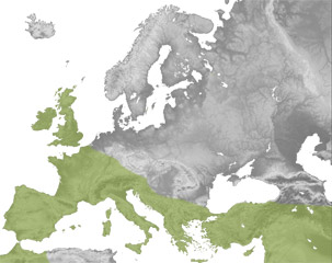 Subespezie hau Europa hegoaldean, Mediterraneoko hainbat irlatan eta Ekialde Hurbilean banatzen da. Britaniar irletan eta Irlandan naturalizatu da, eta gainontzeko banaketan ere ez dago argi non den jatorrizkoa eta non naturalizatua. Euskal Herrian kostaldeko zenbait haranetan agertzen da.