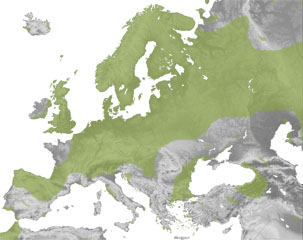 Ia Europa osoan aurkitzen da baina ez da batere arrunta eskualde mediterranearrean. Asiako erdialderaino zabaltzen da. Euskal Herrian, hala ere, oso populazio gutxi gelditzen dira, Araban Baia ibaiaren inguruan eta Ametzagan; Bizkaian Karrantzan eta Nafarroan Erro, Auritz, Orreaga eta Artzi inguruetan eta Urrobi bailaran ikusi izan da.